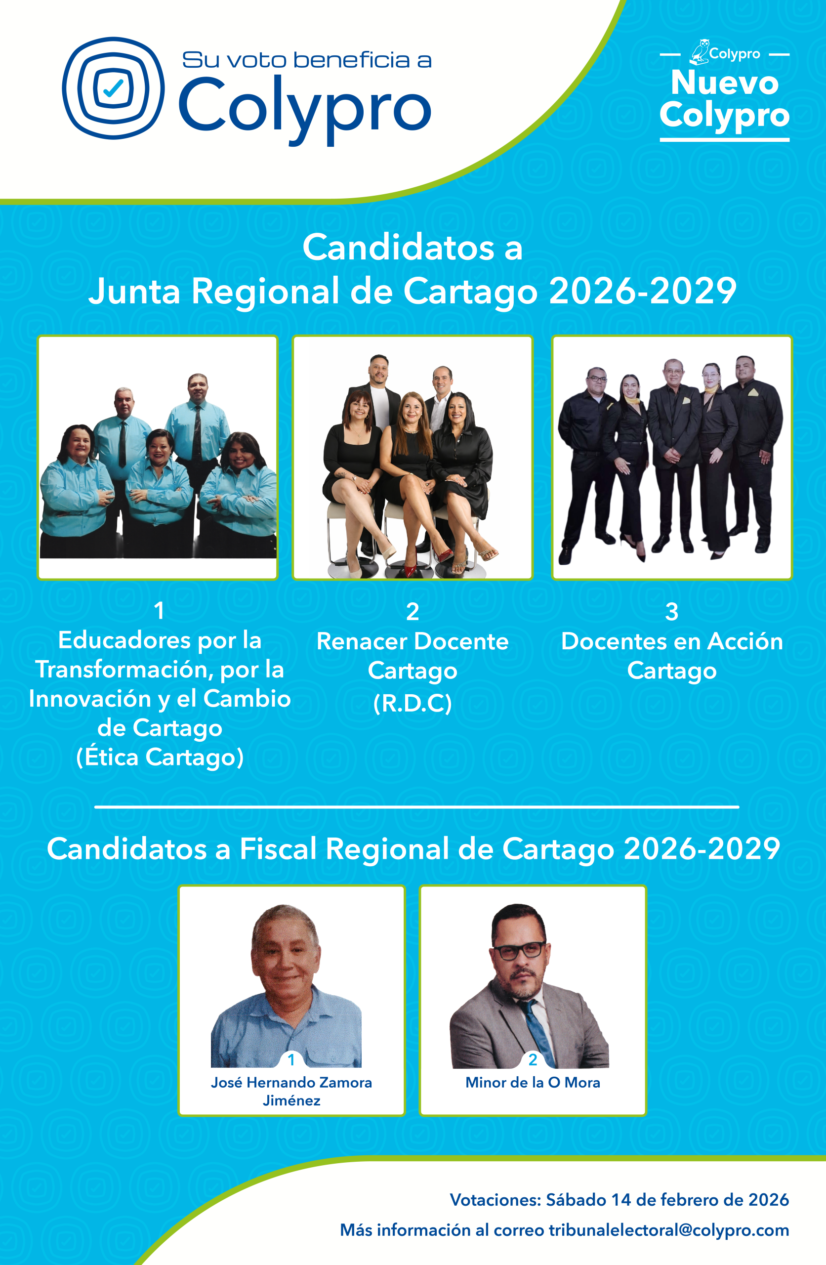 Conozca las agrupaciones y candidatos que forman parte del proceso electoral de la Junta Regional y Fiscalía de Coto 2026-2029.