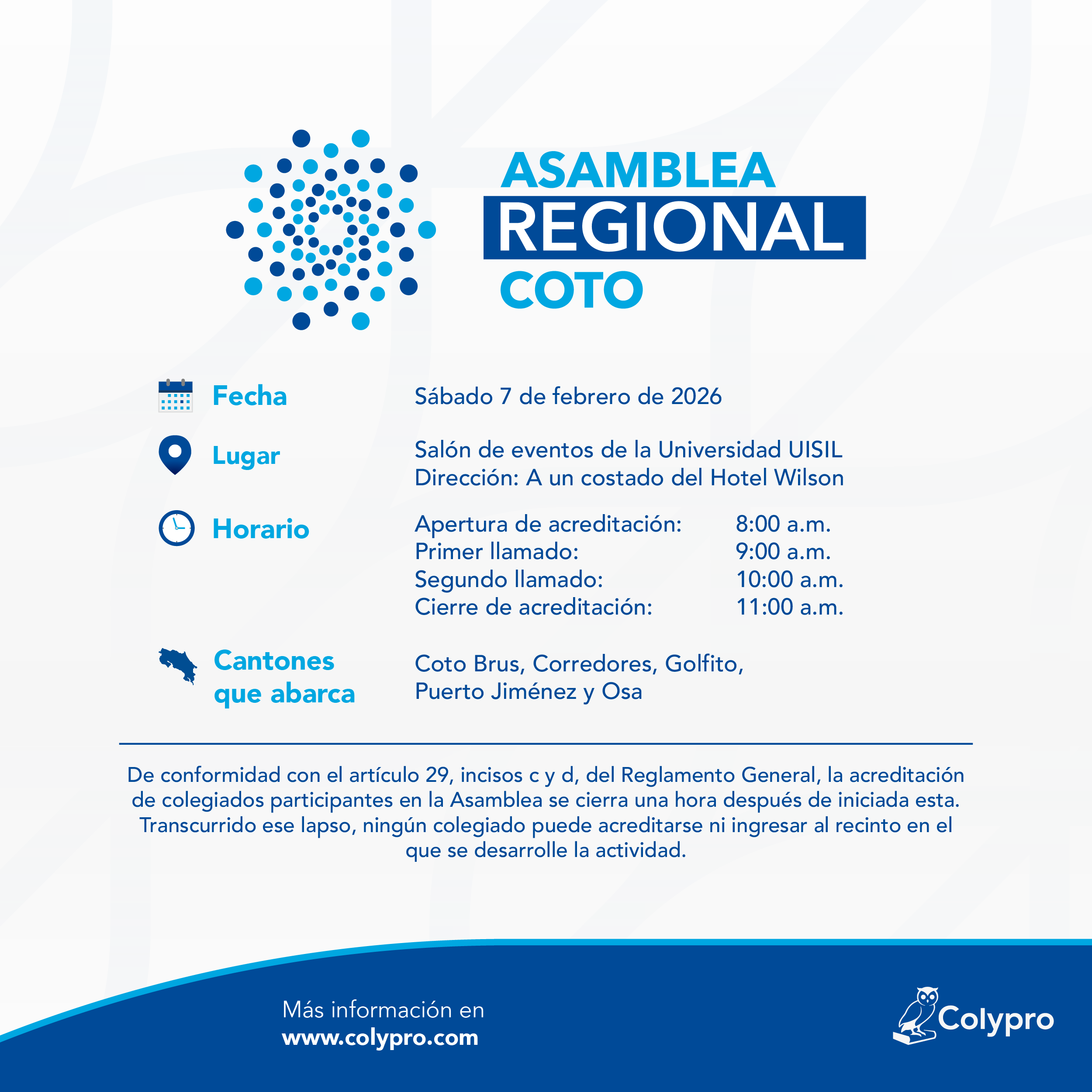 Revise el padrón electoral para conocer la regional en la que se encuentra empadronado: https://www.colypro.com/padron-electoral